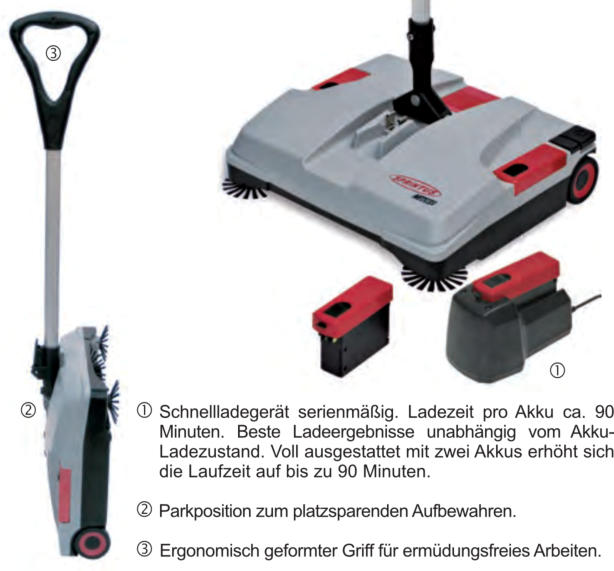 Gewerbliche Akkukehrmaschine für die schnel-le, kabllose und leise Zwischenreinigung aller Oberflächen, In-