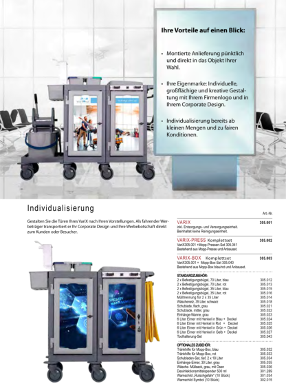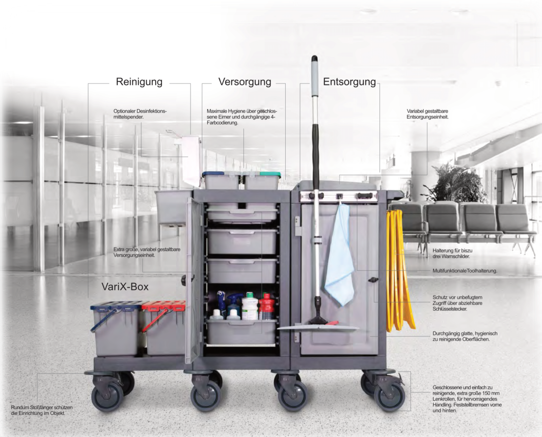 Mit insgesamt drei qualitativ erstklassigen Ausführungen des geschlossenen Reinigungswagens VariX, bieten wir maximaen Nutzen und höchste Hygienestandards für den täglichen Einsatz im Gesundheitswesen und in HoReCa-Bereichen. Die modulare Bauweise ist vielfältiger denn je und ermöglicht für jeden Anwendungsbereich die passende Lösung. Die glatten und einfach zu reinigenden Oberflächen sowie geschlossene Hygienerollen, Eimer und Mopp-Boxen, ermöglichen den Einsatz auch unter Einhaltung von höchsten Hygienevorschriften. Die abschließbaren Türen sorgen für maximale Sicherheit im Objekt. Große, ausziehbare Schubladen bieten ein hohes Ladevolumen. Die großen 150 mm Lenkrollen überwinden mühelos Schwellen und garantieren auch bei voller Beladung einfaches Manövrieren. Die VariX - Reihe ist ein verlässlicher Partner zu einem hervorragenden Preis-Leistungs-Verhältnis und einem hohen Maß an Wirtschaftlichkeit.