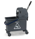 Für die Flur-, Zimmer- und Badreinigung in öffentlichen Einrichtungen, Büros, Hotels, Pensionen. Farblich getrennte Wischeimer und Halterung für Wäsche-/ Müllsack.Der Reinigungswagen in Profiqualität besteht aus zwei robusten Kunststoff Bodenplatten, wobei die hintere Ablage je nach Bedarf abgenommen werden kann. Die stabilen Metall-Lenkrollen und die großen, gummierten Hinterräder erfüllen die Anforderungen für den täglichen, Einsatz. Der Deckel über dem Wäsche-/ Müllsack kann bequem vom ergonomisch geformten Schubbügel aus bedient werden. Ein Mopp oder Besen kann sicher im integrierten Halter fixiert werden. Für das Warnschild ist eine gesonderte Halterung am Rahmen integriert. Serienmäßig wird der PuriX mit vier Eimern, einer seitlichen Moppablage, geräumigem 120 Liter Wäsche-/Müllsack und einer Doppelbacken-Mopp-Presse ausgeliefert. Am Wagen kann eine Medusa Akkukehrmaschine mitgeführt werden.