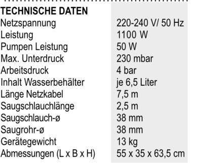 Gewebeart. Beide Modelle sind ausgestattet mit einer Pumpe (28 W/ 0,95 Liter/ Minute/ 4 bar) und abnehmbarem Reinigungsmitteltank mit einem